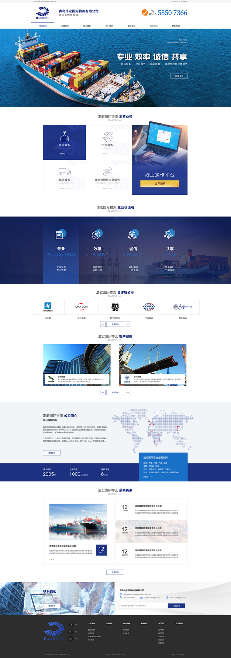 青島浩宏國(guó)際物流有限公司成立于2005年,注冊(cè)資金1000萬(wàn)元人民幣;是經(jīng)交通運(yùn)輸部批準(zhǔn)的無(wú)船承運(yùn)人(NVOCC NO:MOC-NV-07032),國(guó)際航運(yùn)企業(yè)聯(lián)盟發(fā)起會(huì)員,中國(guó)航運(yùn)物流俱樂(lè)部理事單位,JC錦程物流網(wǎng)頂級(jí)服務(wù)商。 公司自成立起,一直專(zhuān)注于非洲航線,通過(guò)不懈努力早已經(jīng)成為華北三港非洲貨運(yùn)量名列前茅的貨運(yùn)代理公司,也成為MAERSK、SAF、COSCO、CMA、MSC等船公司的核心代理。隨著市場(chǎng)發(fā)展和客戶需求的不斷升級(jí),公司在非洲設(shè)立了分支機(jī)構(gòu),成立報(bào)關(guān)行和陸運(yùn)公司,為客戶提供完善的全程物流運(yùn)輸方案,且已服務(wù)了眾多國(guó)內(nèi)客戶。