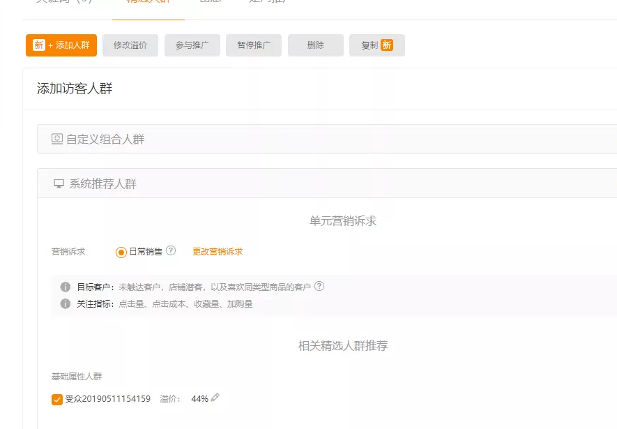 其次做好直通車精選人群,選定人群做溢價(jià)。做直通車精選人群最明顯的作用就是點(diǎn)擊率上的快,所以說(shuō)做直通車精選也是維護(hù)手淘首頁(yè)流量的一種方法。