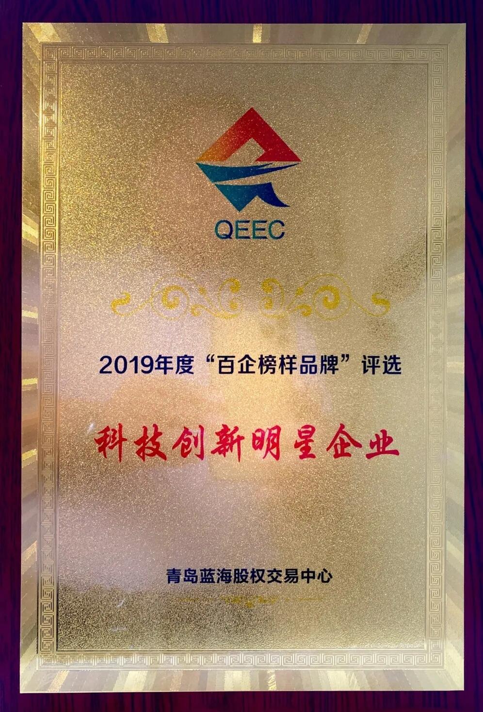 榮獲第五屆“藍海風云榜”之“ 2019年度百企榜樣品牌 ”企業(yè)——“ 科技創(chuàng)新明星企業(yè) ”獎章